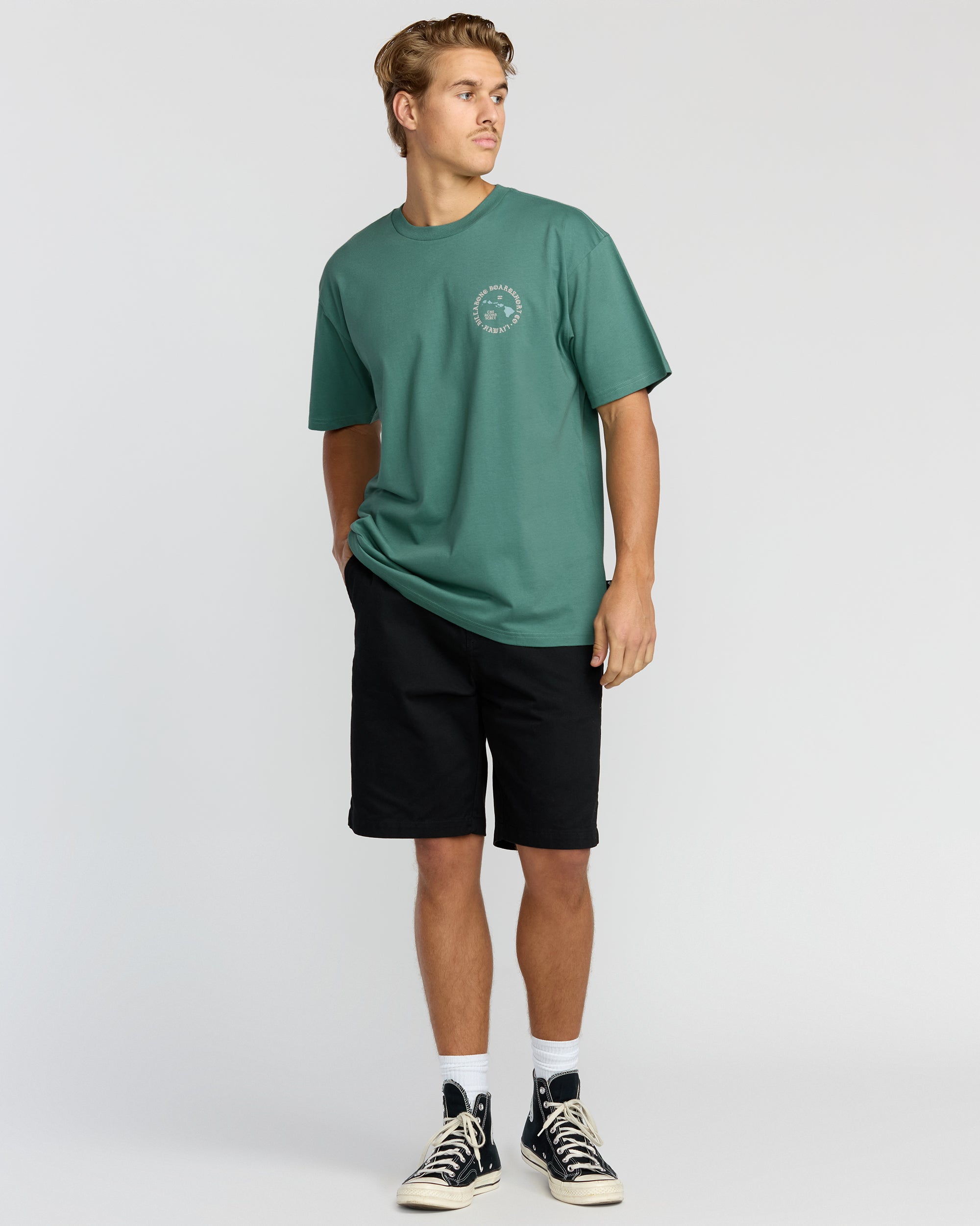 Our classic cotton t-shirt brings island vibes with front and back screen prints. Relaxed shoulders and a wider neck keep things comfortable. while garment washing adds lived-in softness to this regular fit essential. Featured here in the Green colorway.