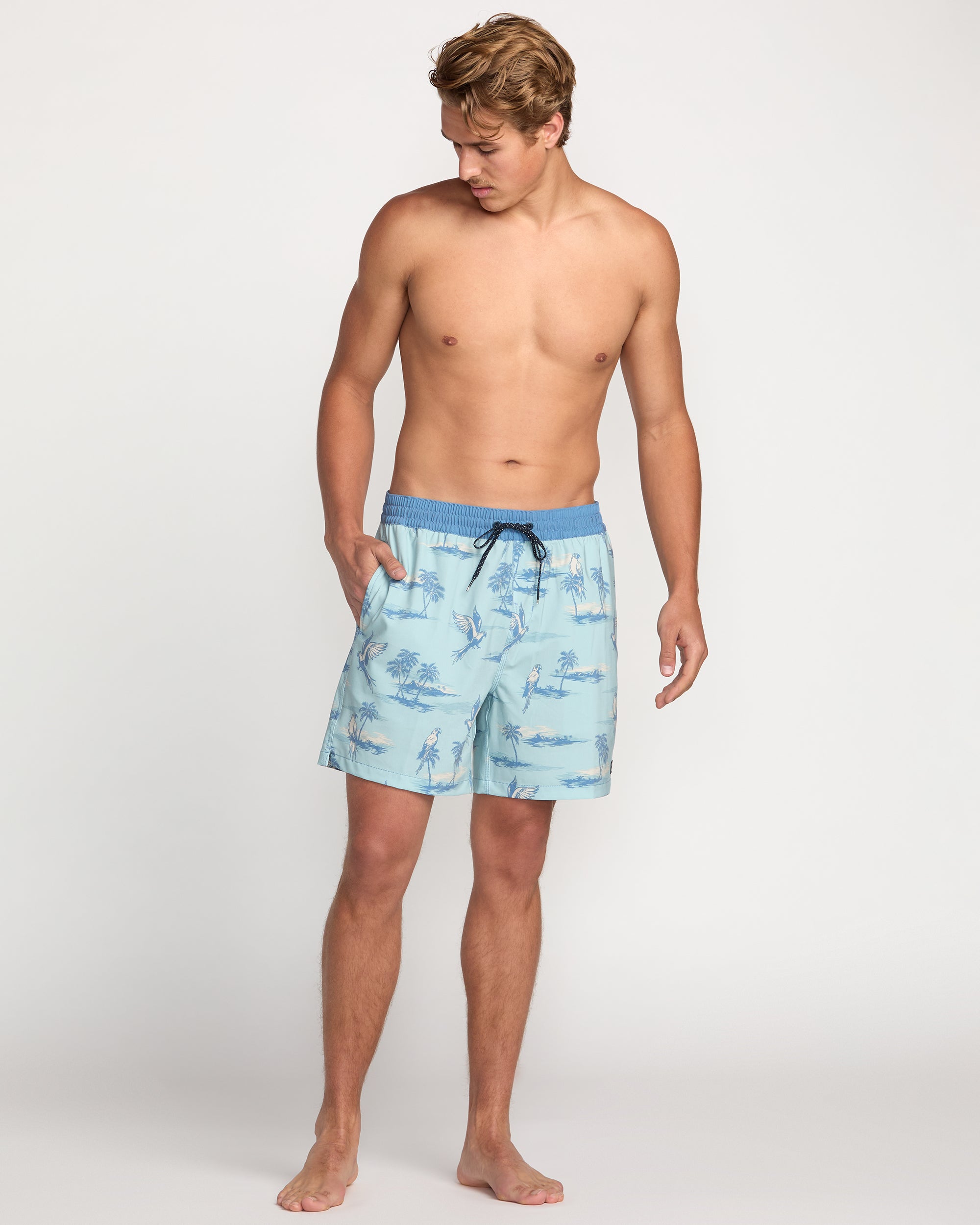 Our comfy layback trunks keep things easy with a 16-inch length and elastic waist. Pro stretch fabric moves with you. while side and back pockets hold essentials for spontaneous summer adventures. Featured here in the Blue colorway.