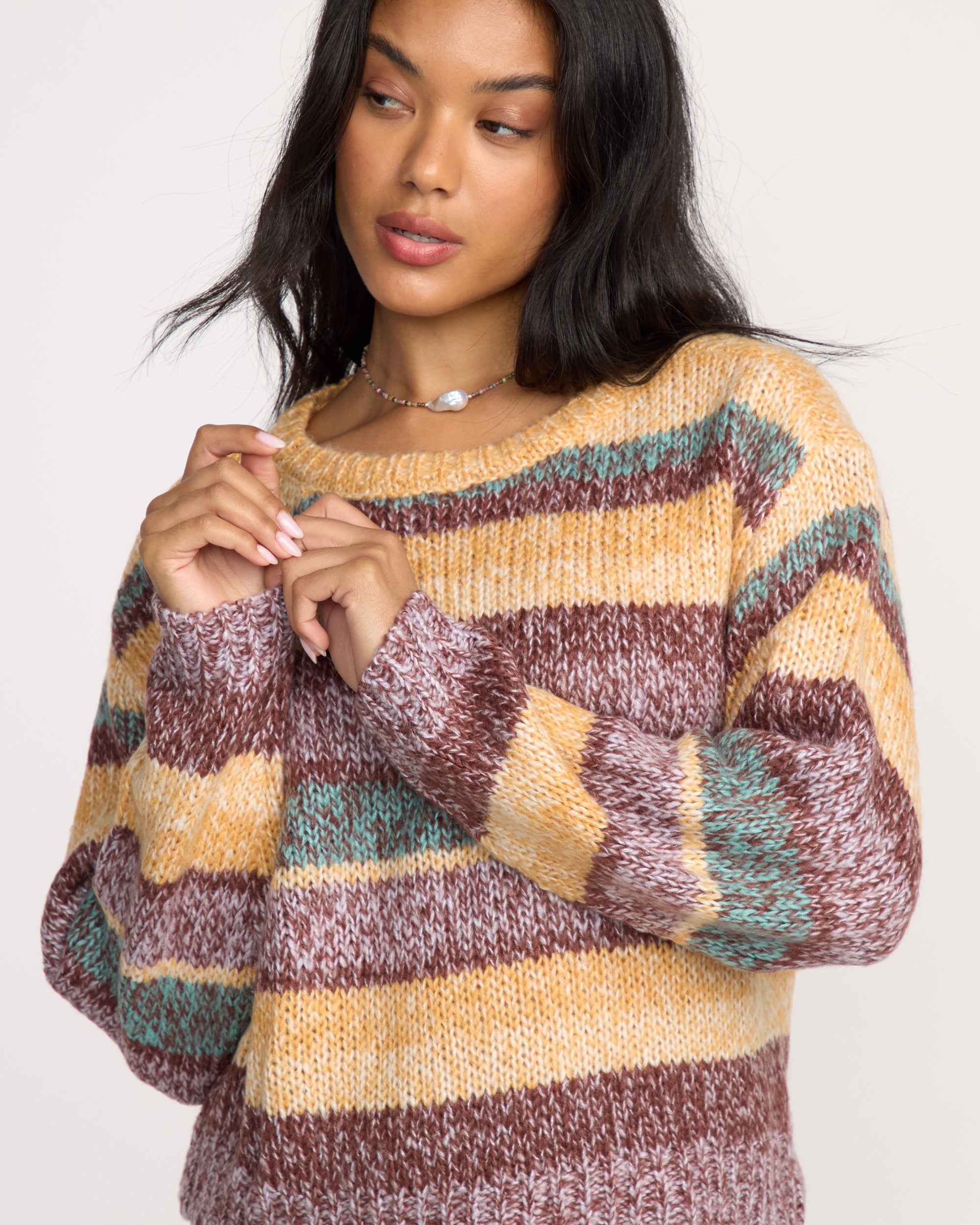 Our relaxed-fit sweater rocks a space dye stripe pattern that catches every eye in the room. The wide neckline and acrylic knit keep you cozy while a metal plate detail adds the perfect finishing touch. Featured here in the Multi colorway.
