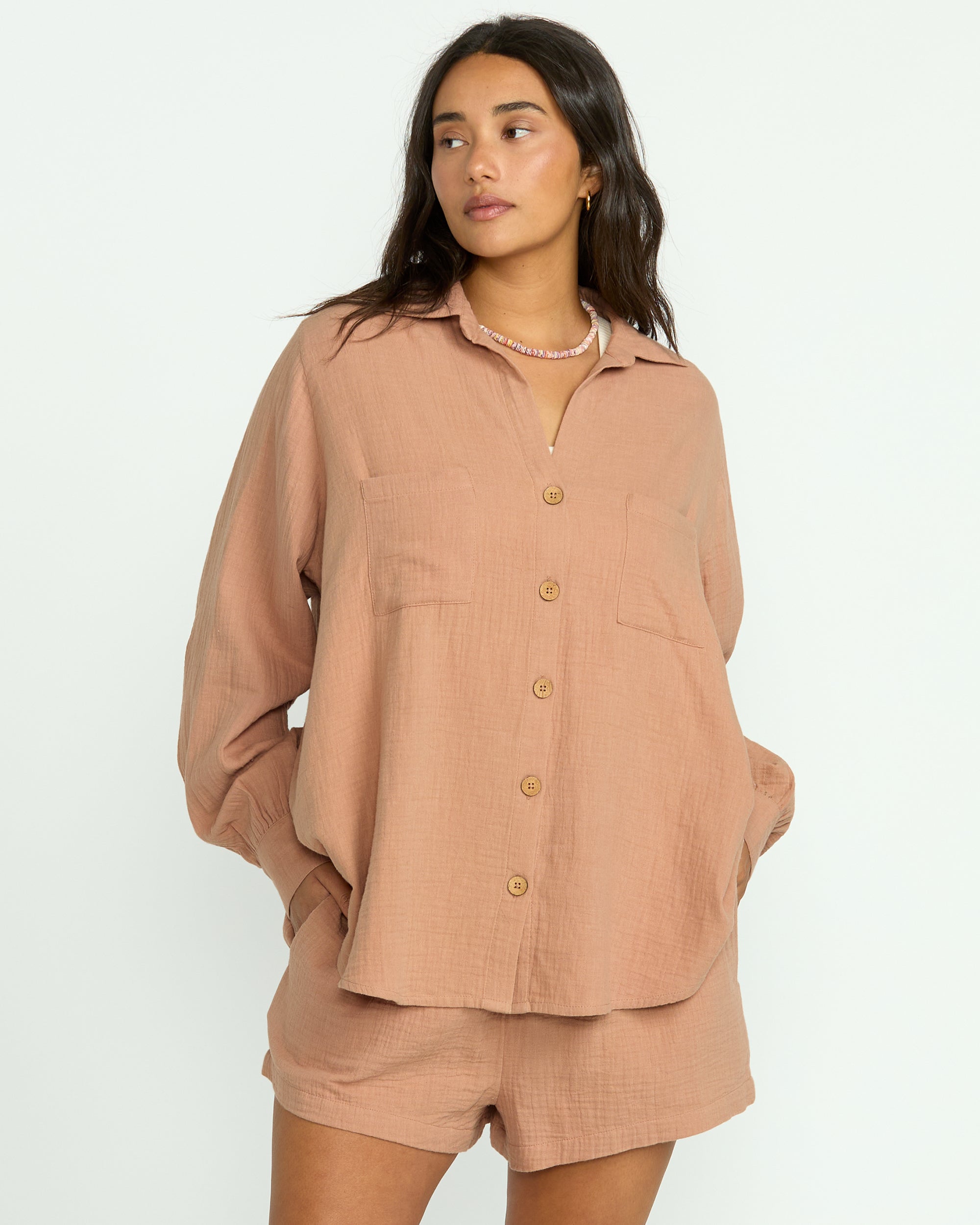 Breezy 100% cotton double gauze shirt with laid-back. oversized fit. Long sleeves. button-down closure. patch pockets. and metal plate. Featured here in the Rose Brown colorway.