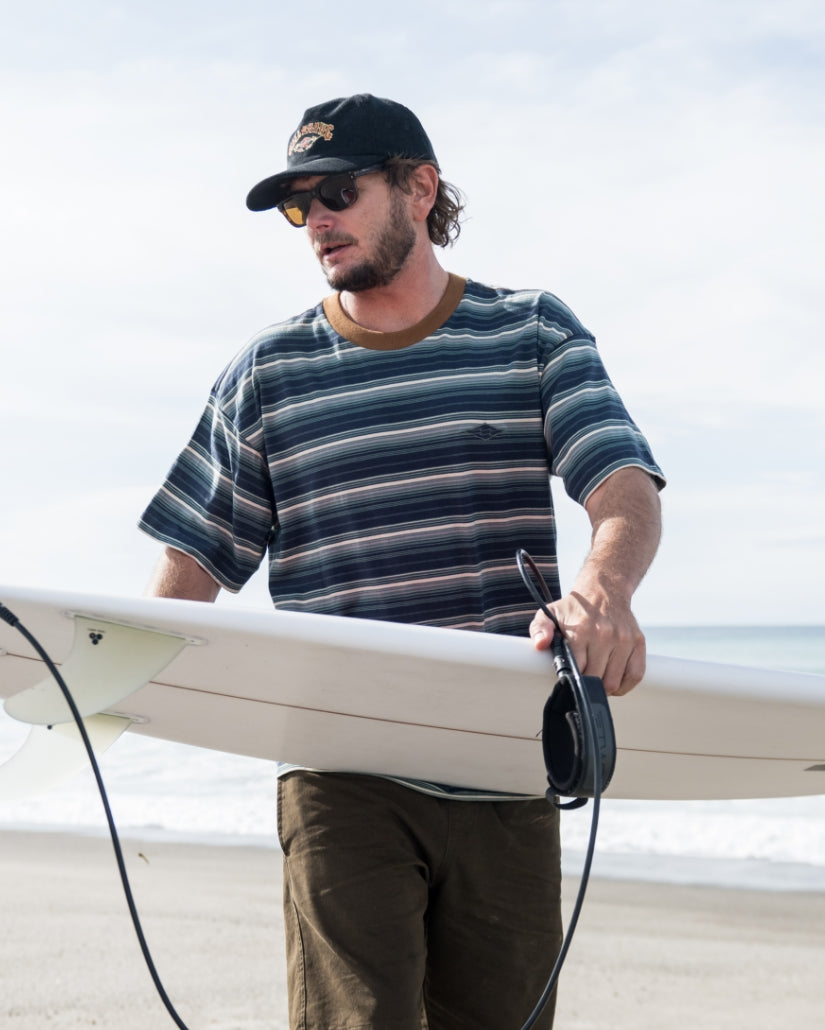 Our throwback cotton t-shirt brings classic style with chest embroidery and a contrast rib collar. The oversized fit features wider shoulders and longer sleeves for that authentic vintage feel. Featured here in the Blue colorway.