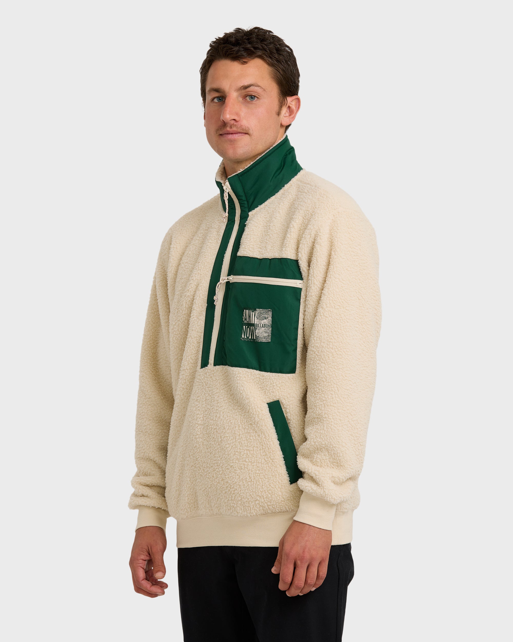 Our throwback mock neck sweatshirt brings retro vibes with an oversized fit and contrast ripstop panels. Cozy fleece construction pairs with practical chest and hand pockets for everyday comfort. Featured here in the Beige colorway.
